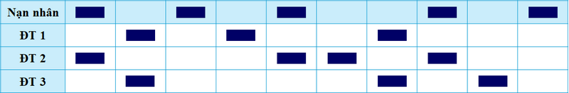 Trong vụ án hình sự, trên móng tay nạn nhân có để lại một số mẫu da nhỏ mà đội điều tra nghi ngờ là của hung thủ. Để giam giữ và điều tra đối tượng tình nghi, đội này yêu cầu cho xét nghiệm ADN ở 3 người là đối tượng 1 (ĐT 1), đối tượng 2 (ĐT 2), đối tượng 3 (ĐT 3) và thu được kết quả như sau: