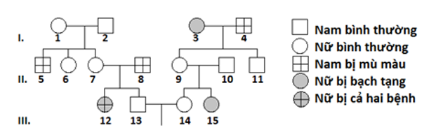 Sơ đồ phả hệ dưới đây mô tả hai bệnh di truyền ở người, bệnh bạch tạng do một gene có 2 allele năm trên NST thường quy định, bệnh mù màu do một gene có 2 allele nằm trên NST × tại vùng không tương đồng trên Y quy định.