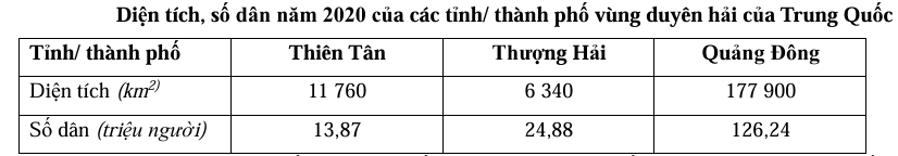 Nhận định nào sau đây đúng về mật độ dân số của các tỉnh/ thành phố vùng duyên hải Trung Quốc năm 2020?