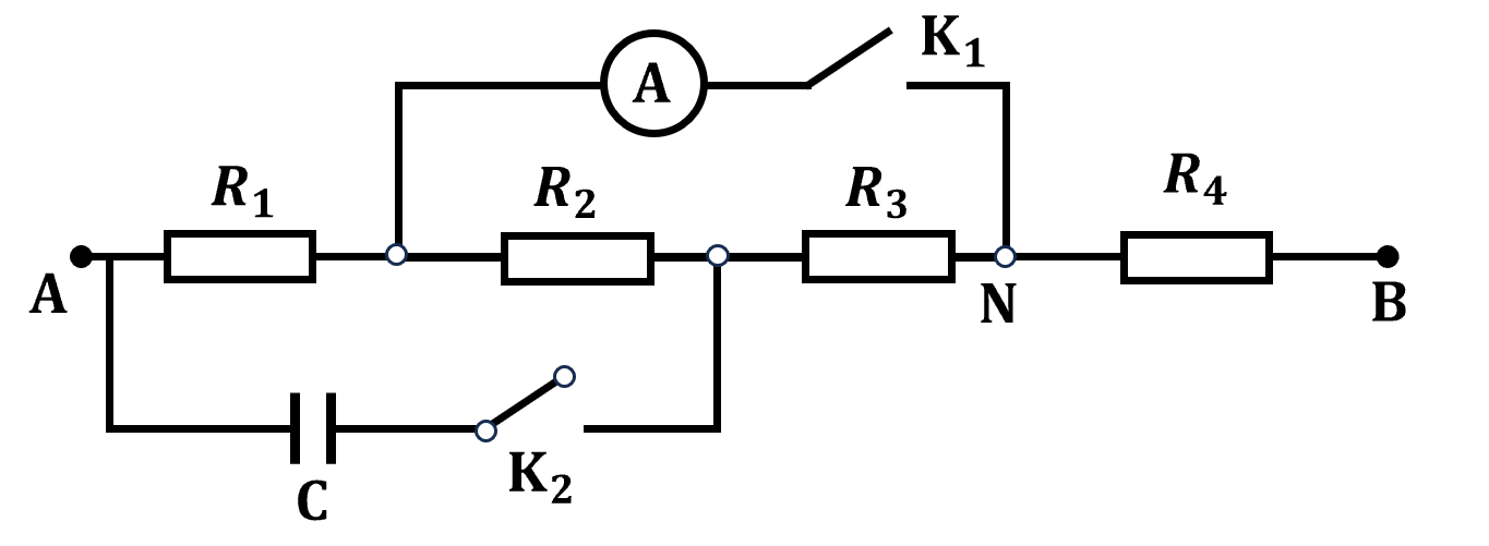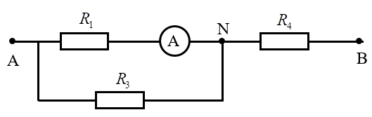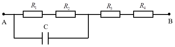 Biết \({R_2} = 4\Omega ,{R_4} = 2\Omega ,C = 2\mu C\). Ampe kế lí tưởng, bỏ qua điện trở dây nối và sự phụ thuộc vào nhiệt độ của điện trở.