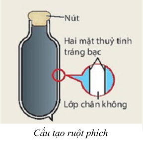 Hãy phân tích tác dụng của các bộ phận sau đây của phích (hình vẽ): Lớp chân không, hai mặt thủy tinh tráng bạc, nút.