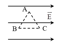Cho 3 điểm A, B, C tạo thành 3 đỉnh của một tam giác đều cạnh 10 cm trong một vùng không gian có điện trường đều, véctơ cường độ điện trường \(\overrightarrow E \) có chiều như hình vẽ (\(\overrightarrow E \) song song với BC) và có độ lớn 3 000 V/m. Công của lực điện thực hiện khi có một điện tích q = 10 nC di chuyển từ A đến B bằng bao nhiêu \(\mu J\)?