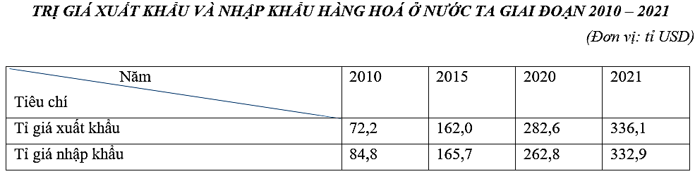 Xác định trị giá xuất khẩu, nhập khẩu hàng hóa ở nước ta giai đoạn 2010 – 2021 qua bảng số liệu và nhận xét xu hướng.