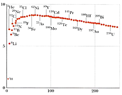 Trên hình là đồ thị biểu diễn sự biến thiên của năng lượng liên kết riêng (trục tung,