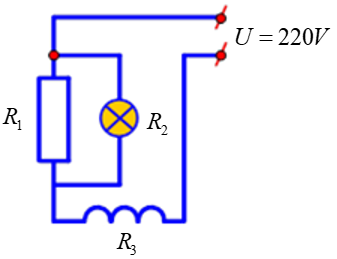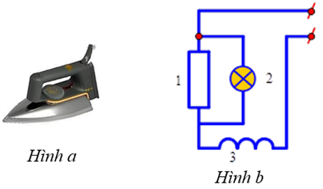 Một bàn ủi (hình a) có thể hoạt động được với dòng điện một chiều và xoay chiều. Đế của bàn ủi có khối lượng 400 g được làm từ hợp kim chịu nhiệt, nhiệt dung riêng của đế là 890 J/kg.K. Sơ đồ mạch điện của bàn ủi (hình b) bao gồm các bộ phận: điện trở Shunt (1) có giá trị \(8\Omega \), đèn báo hiệu (2) có điện trở \(2\Omega \), cuộn dây điện trở (3) coi như điện trở thuần có giá trị điện trở \(98,4\Omega \). Cắm bàn ủi vào mạng điện có hiệu điện thế 220 V. Biết nhiệt độ ban đầu của bàn ủi là \({22^0}C\); 80% nhiệt lượng tỏa ra trên dây điện trở (3) được dùng làm nóng đế bàn ủi và bàn ủi có thể là được quần áo khi nhiệt độ của đế đạt giá trị nhỏ nhất là \({180^0}C\).