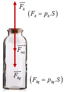Một chai thủy tinh chứa không khí bị bịt kín bằng một nút đang mắc kẹt ở miệng chai. Biết nút làm bằng xốp có khối lượng không đáng kể, tiết diện của miệng chai là \(s = 1,8c{m^2}\), ở nhiệt độ phòng \({27^0}C\) áp suất của khối khí trong chai bằng áp suất khí quyển và bằng 1 atm. Để mở nút chai, một người dùng cách hơ nóng khí trong chai. Khi nhiệt độ của khí trong chai là \({87^0}C\) thì người này thấy nút bật ra ngoài, bỏ qua sự nở vì nhiệt của chai thủy tinh. Lực ma sát tác dụng lên nút chai khi nút chai bật ra là bao nhiêu? (kết quả làm tròn đến chữ số hàng phần trăm).