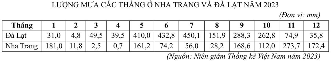 Căn cứ vào bảng số liệu trên, hãy cho biết sự chênh lệch tổng lượng mưa năm 2023 của Đà Lạt và Nha Trang là bao nhiêu mm? (làm tròn kết quả đến hàng đơn vị).