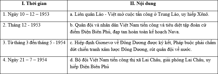 Phương án nào sau đây phản ánh đúng thời gian và hoạt động quân sự - ngoại giao của Việt Nam trong năm 1953 – 1954?