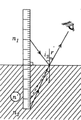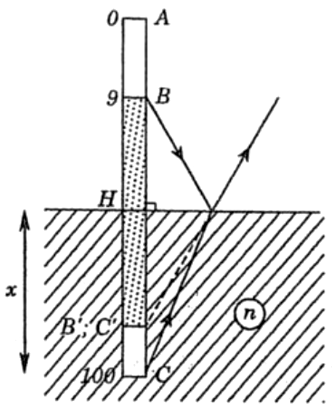 Một chiếc thước thẳng dài 1 m, có 100 độ chia, được nhúng thẳng đứng vào một bể nước. Đầu mang vạch số 100 ở trong nước, đầu mang vạch số 0 ở ngoài không khí. Một người nhìn vào thước theo phương gần như vuông góc với mặt nước. Người đó đồng thời thấy hai ảnh của thước: ảnh của phần thước ở ngoài không khí và ảnh của phần thước nhúng trong nước.