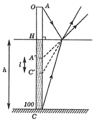 c) Ấn sâu thước cho vạch 100 chạm đáy bể thì thấy ảnh của vạch 100 nằm phía dưới, cách ảnh của vạch số 0 là 19 độ chia. Xác định độ sâu của bể nước. Cho chiết suất của nước là \(\dfrac{4}{3}\).