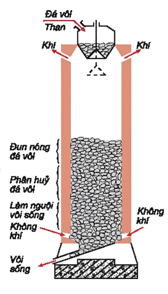 Phản ứng phân hủy đá vôi để tạo ra vôi sống là một phản ứng cần được thực hiện ở nhiệt độ cao. Cụ thể đá vôi cần được đưa tới nhiệt độ khoảng 900oC để quá trình nhiệt phân có thể diễn ra.. Kết quả là thu được vôi sống \(CaO\) và khí \(C{O_2}\). Ở các lò nung vôi công nghiệp, quá trình kiểm soát phát thải ô nhiễm được thực hiện chặt chẽ hơn. Sau một thời gian nhất định, người ta nạp nguyên liệu (đá vôi, than) vào lò; vôi sống được lấy ra qua cửa ở đáy lò; khí \(C{O_2}\) được thu qua cửa phía trên cửa lò và được dùng để sản xuất muối cacbonat, nước đá khô. Khí \(C{O_2}\) liên tục được rút ra khỏi lò tránh quá trình tái tạo lại đá vôi diễn ra.