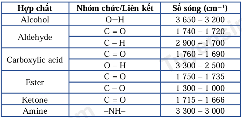 Cho bảng tín hiệu của các nhóm chức trong hợp chất hữu cơ như sau: Người ta