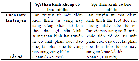 Nêu điểm khác nhau giữa sự lan truyền xung thần kinh trên sợi thần kinh có bao miêlin và sợi thần kinh không có bao miêlin.