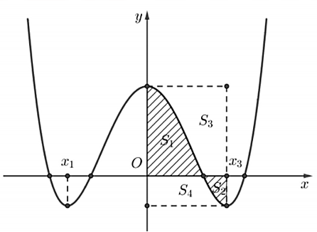 Cho hàm số \(f(x) = a{x^4} + b{x^2} + c\) có đồ thị như hình vẽ. Biết rằng \(f(x)\) đạt cực trị tại các điểm \({x_1};{x_2};{x_3}\) thỏa mãn \({x_3} = {x_1} + 2\) và \(f\left( {{x_1}} \right) + f\left( {{x_3}} \right) + \dfrac{2}{3}f\left( {{x_2}} \right) = 0\). Gọi \({S_1},{S_2},{S_3},{S_4}\) là diện tích các hình phẳng trong hình vẽ bên. Tỉ số \(\dfrac{{{S_1} + {S_2}}}{{{S_3} + {S_4}}}\) gần nhất với kết quả nào dưới đây?
