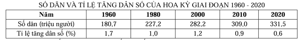 Căn cứ vào bảng số liệu trên, hãy cho biết, dân số Hoa Kỳ năm 2020 so với năm 1960 tăng lên bao nhiêu triệu người? (làm tròn kết quả đến hàng đơn vị của triệu người)
