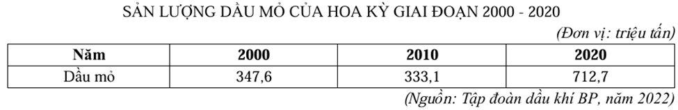 Cho bảng số liệu: Tính tốc độ tăng trưởng sản lượng dầu mỏ của Hoa Kỳ năm 2020 so