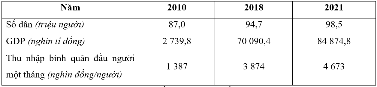 Cho bảng số liệu:Số dân, GDP và thu nhập bình quân đầu người của nước tagiai đoạn