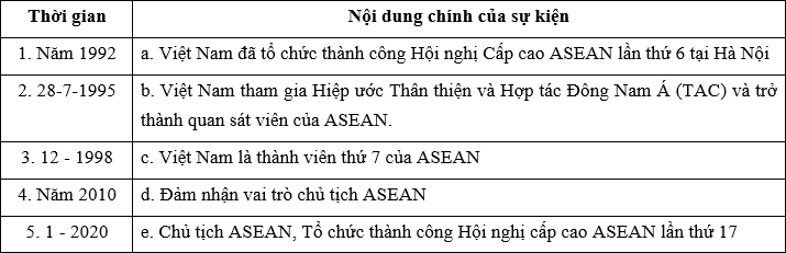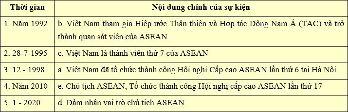 - Xác định thời gian và sự kiện về những hoạt động của Việt Nam trong ASEAN.
