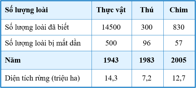 Cho bảng số liệu sau về sự biến động thành phần loài và diện tích rừng