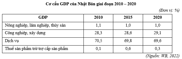 Dựa vào bảng số liệu, nhận xét nào sau đây không đúng về cơ cấu GDP của Nhật Bản giai đoạn 2010 - 2020?