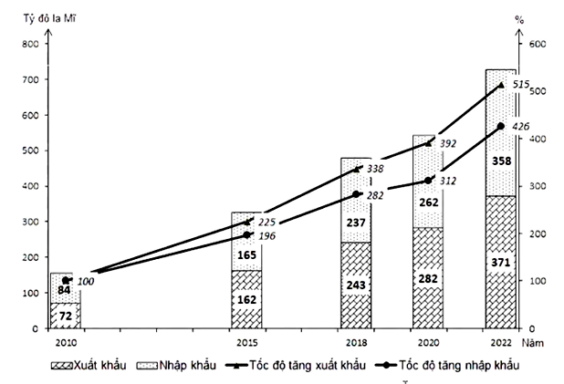 Biểu đồ trên thể hiện nội dung nào về ngành ngoại thương của nước ta giai đoạn 2010 - 2022?