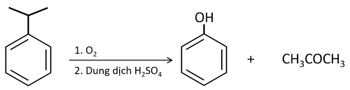 Phenol được tổng hợp từ cumene (isopropylbenzene) bằng phản ứng oxi hóa bởi oxygen rồi thủy phân trong môi trường acid thu được hai sản phẩm là phenol và acetone theo phương trình hóa học sau: