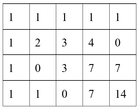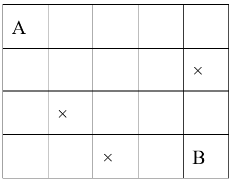 Một con kiến di chuyển trên một bàn cờ từ ô vuông A đến ô vuông B như hình vẽ. Trong một lần di chuyển, con kiến chỉ có thể di chuyển sang ô bên phải hoặc xuống ô phía dưới. Trong bàn cờ có một số ô vuông chứa các vật cản được đánh dấu “×”, con kiến không thể đi vào các ô vuông đó. Hỏi con kiến có bao nhiêu cách đi từ ô vuông A tới ô vuông B?