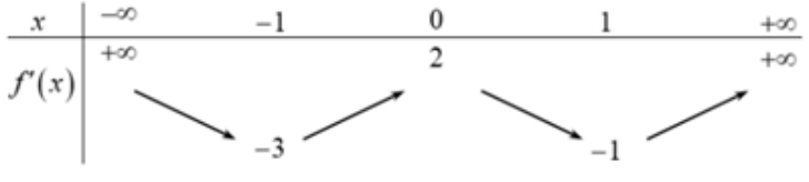 Cho hàm số \(y = f\left( x \right)\)có đạo hàm xác định trên \(\mathbb{R}\). Bảng biến thiên của \(f'\left( x \right)\) được cho như hình vẽ dưới đây.