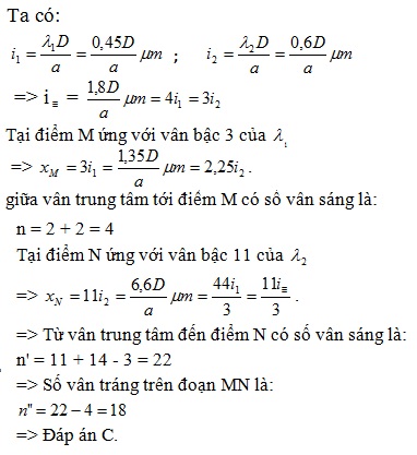 Trong thí nghiệm I-âng, chiếu đồng thời hai bức xạ có bước sóng λ1 = 0,45 μm và λ2 = 0,6 μm. Trên màn quan sát, gọi M, N là hai điểm nằm cùng một phía so với vân trung tâm. Biết tại điểm M trùng với vị trí vân sáng bậc 3 của bức xạ λ1; tại N trùng với vị trí vân sáng bậc 11 của bức xạ λ2. Tính số vân sáng quan sát được trên đoạn MN ?
