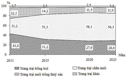 Xác định tỉ trọng từng trang trại trong giai đoạn 2011 – 2023 và chọn nhận xét đúng.