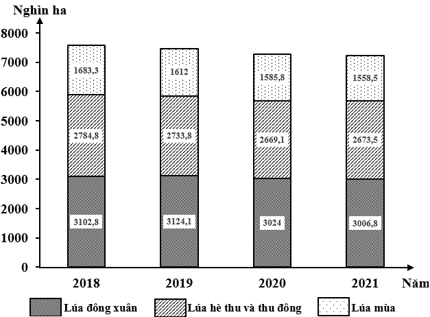 Biểu đồ dưới đây thể hiện nội dung nào về diện tích lúa cả năm phân theo mùa vụ của nước ta giai đoạn 2018 – 2021?