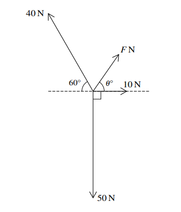 Độ lớn của các lực lần lượt là \(F{\rm{ N}},{\rm{ }}10{\rm{ N}},{\rm{ }}50{\rm{ N, }}40{\rm{ N}}.\) Góc tạo bởi lực có độ lớn \(F{\rm{ N}}\) và phương ngang có độ lớn bằng \(\theta .\) Biết rằng chất điểm đang ở trạng thái cân bằng, tức là tổng các lực tác dụng lên nó bằng \(0,\) khi đó giá trị của \(\dfrac{F}{\theta }\) (làm tròn đến hai chữ số thập phân) bằng