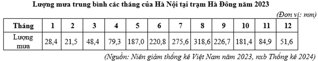 Căn cứ vào bảng số liệu trên, hãy cho biết năm 2023, tháng mưa nhiều nhất của Hà Nội tại trạm Hà Đông gấp bao nhiêu lần tháng mưa ít nhất? (làm tròn kết quả đến một chữ số thập phân của đơn vị lần).