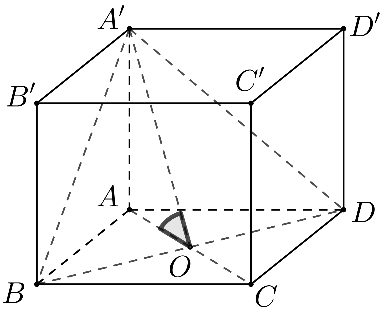 | a) Góc giữa hai mặt phẳng \(\left( {A'BD} \right)\) và \(\left( {ABCD} \right)\) là góc \(\angle {A'OA}\). | ||