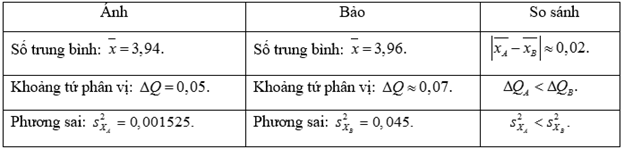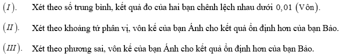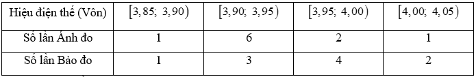 Trong thí nghiệm đo hiệu điện thế của cùng một dòng điện, hai bạn Ánh và Bảo đã dùng hai vôn kế khác nhau để đo, mỗi bạn tiến hành đo 10 lần cho kết quả như sau: