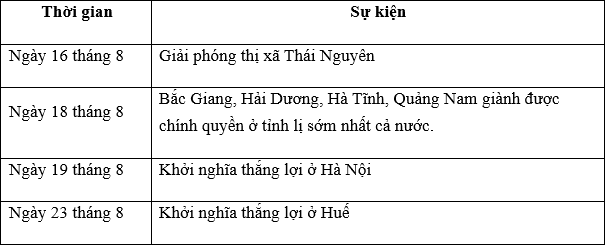 | a) Bảng tư liệu đề cập đến những mốc thắng lợi quan trọng của Tổng khởi nghĩa trong cách mạng tháng Tám năm 1945 ở Việt Nam. | ||