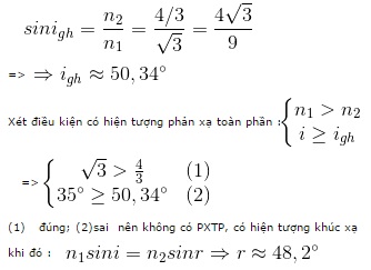Tìm góc giới hạn phản xạ toàn phần Khi góc tới là 350 thì có hiện tượng phản xạ toàn phần hay có hiện tượng khúc xạ? Nếu có hiện tượng khúc xạ, hãy tính góc khúc xạ.