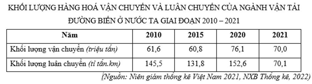 Dựa vào bảng số liệu và nhận xét sự thay đổi khối lượng hàng hoá vận chuyển và luân chuyển của ngành đường biển nước ta giai đoạn 2010 – 2021.