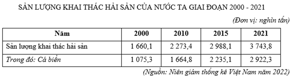 Dựa vào bảng số liệu trên, cho biết sản lượng khai thác hải sản của nước ta năm 2021 gấp bao nhiêu lần năm 2000. (Kết quả lấy đến 1 chữ số sau dấu phẩy thập phân)