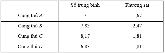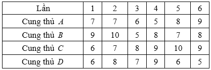 Bốn cung thủ \(A,B,C,D\) thi đấu với nhau và được ghi lại kết quả sau 6 lần bắn như sau:Hỏi