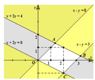 Giá trị nhỏ nhất của biểu thức \(F = 4x - 7y\) trên miền xác định bởi hệ bất phương trình \(\left\{ {\begin{array}{*{20}{l}}{0 \le x - y \le 3}\\{0 \le x + 2y \le 4}\end{array}} \right.\) là