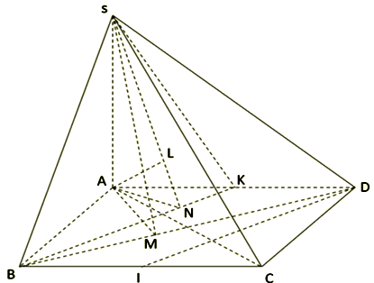 \(d\left( {DI,SB} \right) = d\left( {DI,\left( {SBK} \right)} \right) = d\left( {D,\left( {SBK} \right)} \right) = d\left( {A,\left( {SBK} \right)} \right) = AL\) với K là trung điểm của \(AD\), \(AN \bot BK\) tại \({\rm{N}},{\rm{AL}} \bot {\rm{SN}}\) tại L.