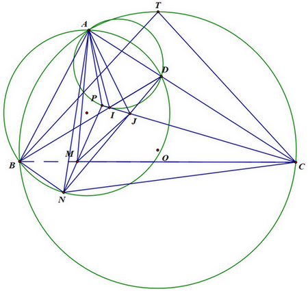 2) Gọi \(P\) là giao điểm khác \(I\) của đường thẳng \(CI\) và đường tròn ngoại tiếp tam giác \(AID\), đường thẳng \(PM\) cắt đường thẳng \(JD\) tại \(N\). Chứng minh rằng bốn điểm \(N,M,J,C\) thuộc một đường tròn.