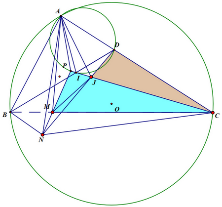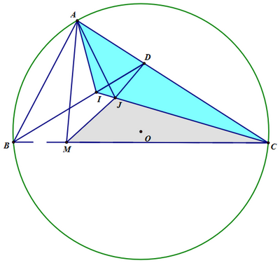 Cho đường tròn \(\left( O \right)\) cố định và điểm \(A\) cố định trên \(\left( O \right)\), các điểm \(B,C\) thay đổi trên \(\left( O \right)\) sao cho \(B,C\) không trùng \(A\) và \(AC < BC\). Điểm \(M\) trên đoạn \(BC\) sao cho \(\angle {MAC} = \angle {ABC}\). Gọi \(I\) là tâm đường tròn nội tiếp tam giác \(ABC\) và \(BI\) cắt \(AC\) tại \(D\). Gọi \(J\) là tâm đường tròn nội tiếp tam giác \(MAC\).
