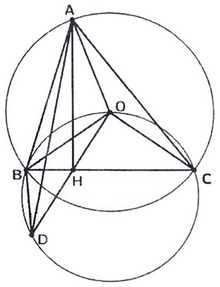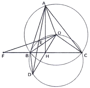 Cho tam giác \(ABC\) nhọn \((AB < AC)\) có đường cao \(AH\) và nội tiếp đường tròn \(\left( O \right)\). Gọi \(\left( {O'} \right)\) là đường trờn ngoại tiếp tam giác \(OBC,D\) là giao điểm của \(OH\) và \(\left( {O'} \right)(D\) khác \(O\)).
