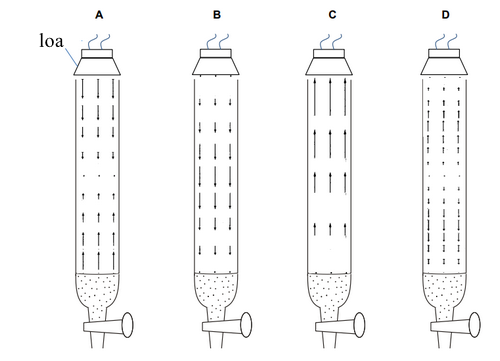 Một chiếc loa phát ra âm thanh có tần số cố định được giữ ở phía trên đỉnh của một ống buret chứa đầy nước. Nước từ từ chảy ra khỏi ống buret cho đến khi nghe thấy âm thanh có độ to tối đa. Câu nào sau đây thể hiện tốt nhất một mô hình sóng dừng có thể được thiết lập bởi các phân tử không khí trong ống buret ở vị trí này?