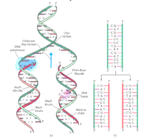 | a) Các mạch mới được tổng hợp theo chiều 5' - 3' nhờ sự xúc tác của enzyme DNA polymerase. | ||