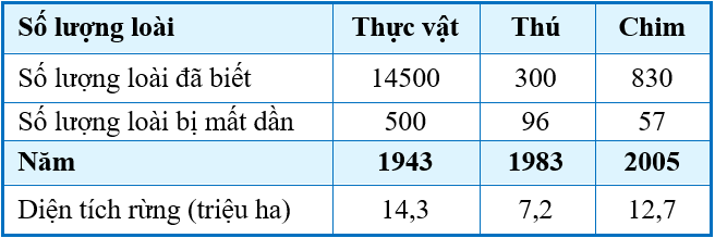 Cho bảng số liệu sau về sự biến động thành phần loài và diện tích rừng