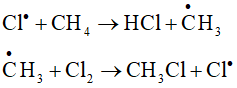 Phản ứng chlorine hóa methane khi chiếu sáng xảy ra theo cơ chế gốc gồm ba giai đoạn: khơi mào, phát triển mạch và tắt mạch. Trong đó, giai đoạn phát triển mạch diễn ra như sau:
