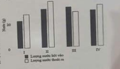 Khi đo lượng nước thoát ra và lượng nước hút vào của 4 cây cà chua trong cùng một đơn vị thời gian thu được kết quả thể hiện trong biểu đồ bên.
